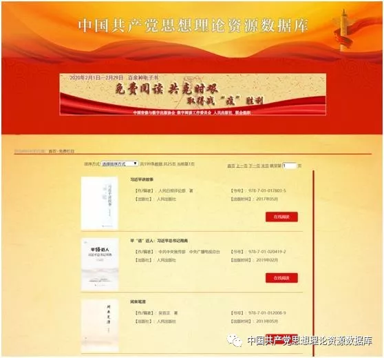 为积极响应中国音像与数字出版协会、数字阅读工作委员会牵头发起的《数字阅读行业战“疫”倡议书》,人民出版社特在中国共产党思想理论资源数据库首页开设“免费阅读,共克时艰,取得战‘疫’胜利”专栏,精选我社出版的人文社科、卫生防疫、历史文学等方面优质图书的电子书供读者免费阅读。专栏首批收录图书199本,后期我社将持续更新疫情防控方面的图书,希望通过丰富优质的内容资源更好地满足特殊时期广大读者的文化生活需求,不断增强全国人民战胜疫情的决心和信心,为打赢疫情防控阻击战贡献力量!