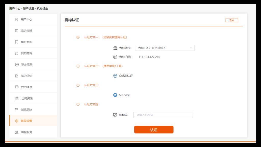 1)校内IP范围内的用户,进入“用户中心”点击“认证”,选择“认证方式一”,即可实现“IP认证”。用户IP认证后,每次享有最长60天的离校访问权限。
