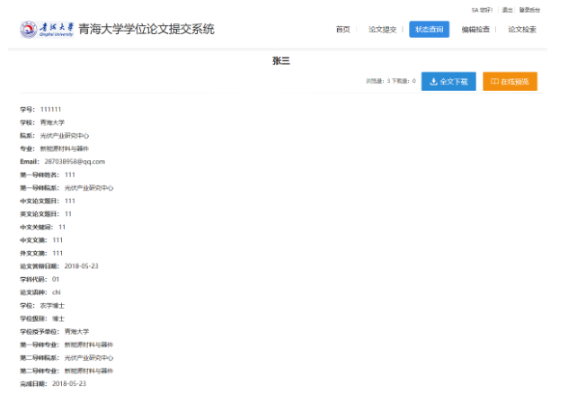 (2)论文审核通过后,在状态查询中,点击论文通过审核的“确定”按钮,会显示本人论文的详情页面(如下图),并将该页面截图,发到709448758@qq.com邮箱中,以此作为论文提交完成、审核通过、符合条件的依据。