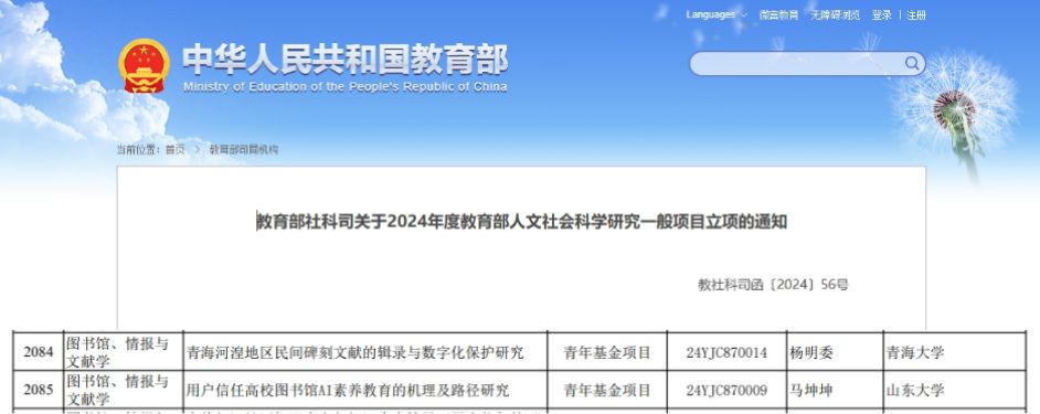 此前,教育部社科司发布2024年度教育部人文社会科学研究一般项目立项通知,图书馆采编部主任杨明委获批青年基金项目。